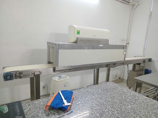Băng tải PU tích hợp với máy dò kim loại, cân kiểm tra trọng lượng, máy in date… giúp kiểm soát chất lượng cuối cùng trước khi đóng hộp.